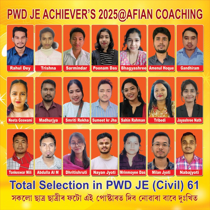 APSC JE coaching for Civil & Electrical Engineering since 2008 . We provide expert guidance, comprehensive study materials, and result -oriented coaching to help aspirants achieve success in the Assam Public Service Commission (APSC) AE and JE examination . Achievers year wise ( in year 2016 - 2 students, 2017 - 12 students, 2018 - 19 students, 2019 - 16 students and 2020 and 2021 it was Corrona period , so no exam no results but in the year 2022 - 183 students in APSC JE - PNRD,IRRIGATION, WRD, FISHARY. In the year 2023 - 63 students in Irrigation . In the year 2024 - 87 students in PWD-PHE-GMC-APDCL-AEGCL and this year - 33 students in PHE JE , 61 students in PWD JE, & 17 students in WRD . Total selection 111